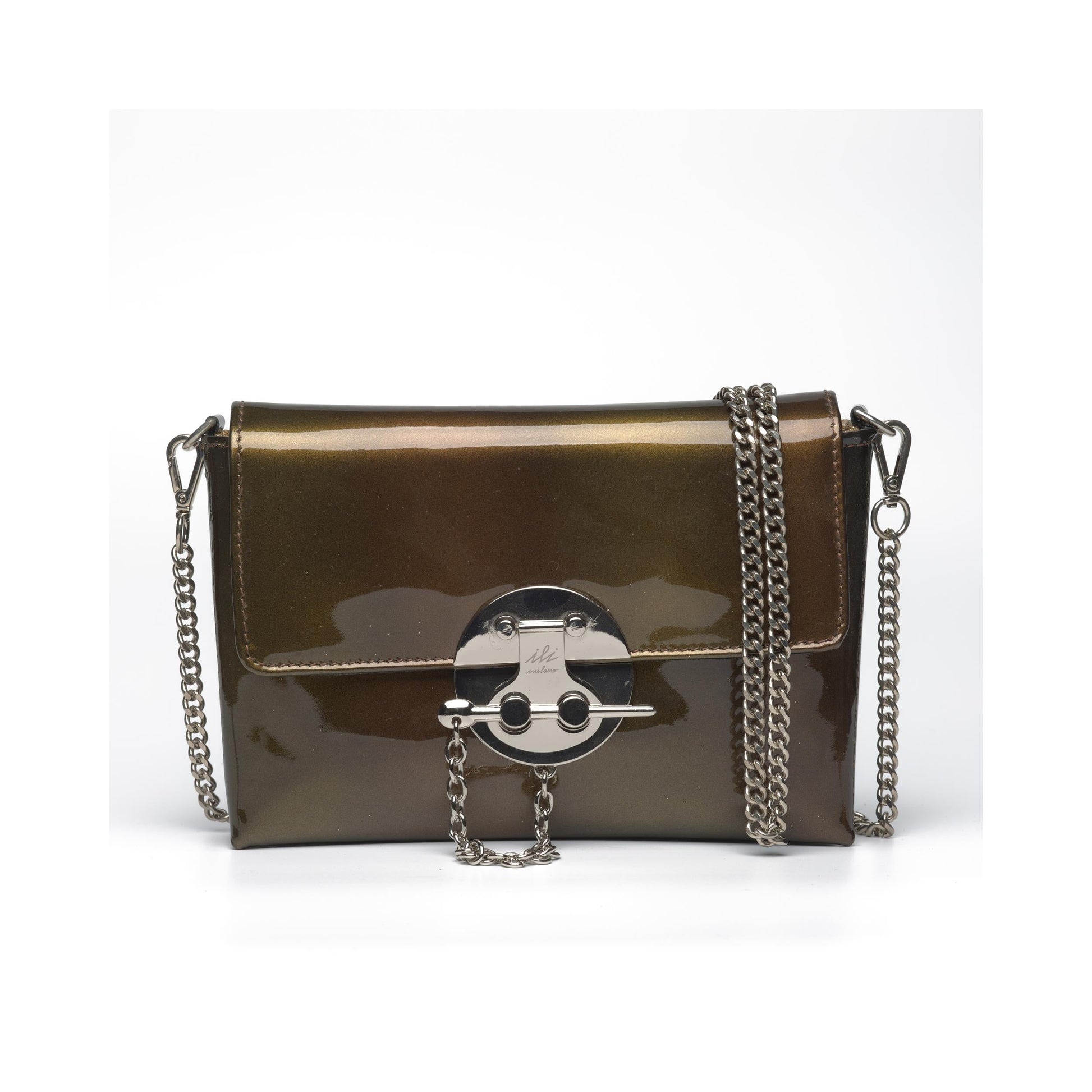 borsa in pelle (vernice) bronzo, accessorio argento con catena annessa, interno in tessuto glitter oro